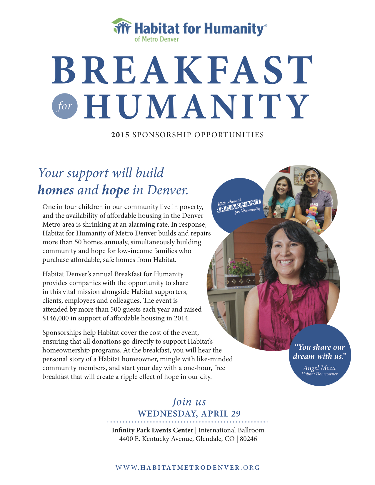 I designed this sponsorship packet for Habitat for Humanity of Metro Denver’s corporate relations team. The packet was presented to community partners to encourage them to sponsor and participate in the 12th annual Breakfast for Humanity. November 2014.