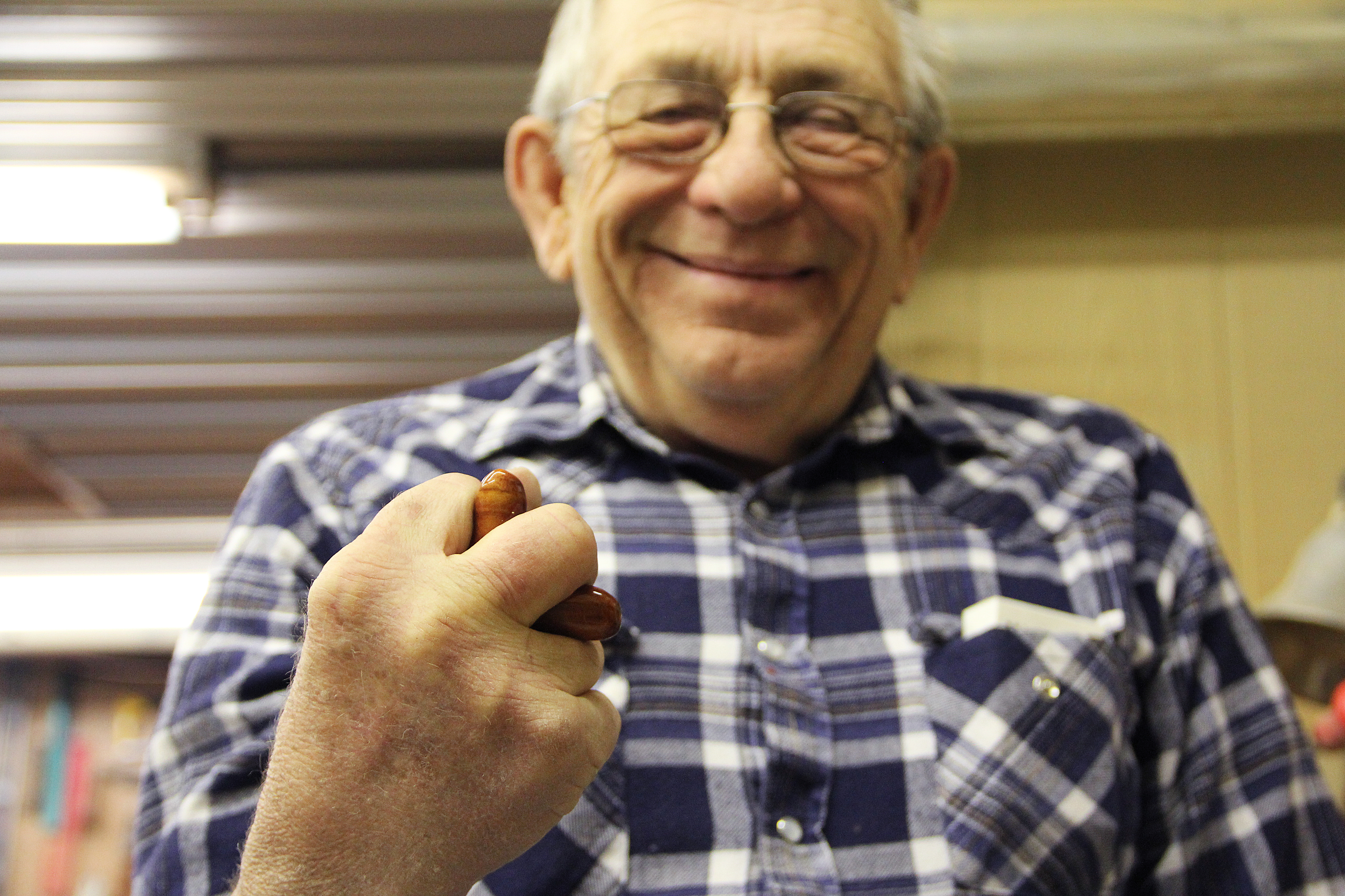 Steve Mohling, member of the cross ministry of First St. Paul’s Lutheran Church, demonstrates how to hold a hand-cut wooden cross when praying. Mohling and the other members of the cross ministry cut, polish and distribute the crosses to friends and strangers around the world from a small workshop in rural Hastings. March 3, 2014.