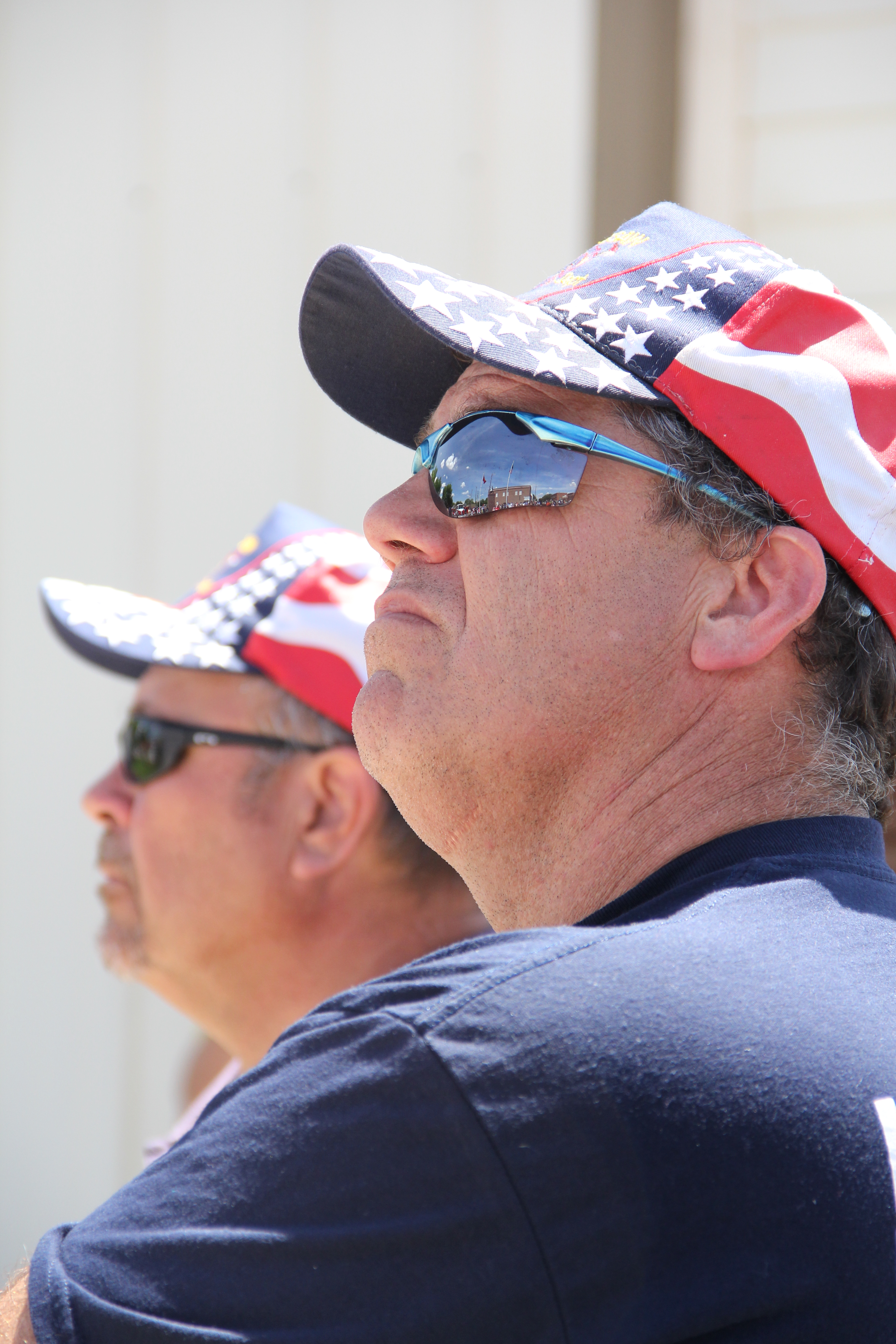 Two members of the Kenesaw Fire Department watch as a flag is raised on the newly-revealed Kenesaw Memorial downtown on May 26, 2014.