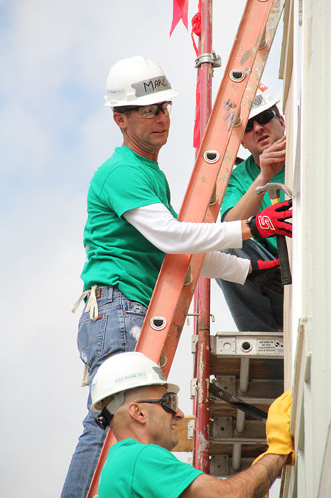 Marc Beshany, managing director of the Wells Fargo Rocky Mountain Market, installs siding with the help of two other executives at Habitat for Humanity of Metro Denver’s CEO Build on October 10, 2014.